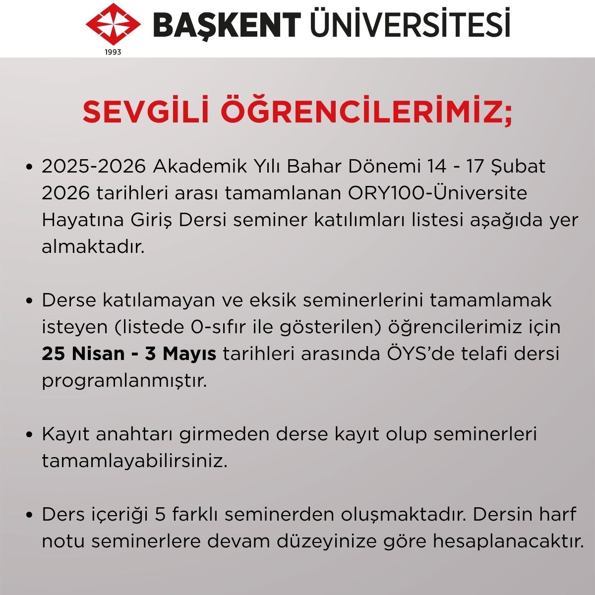 Listede 1(bir) ile gösterilen seminer katılımları tamamlanmış olduğu için telafi derste aynı seminerlere tekrara gerek yoktur.